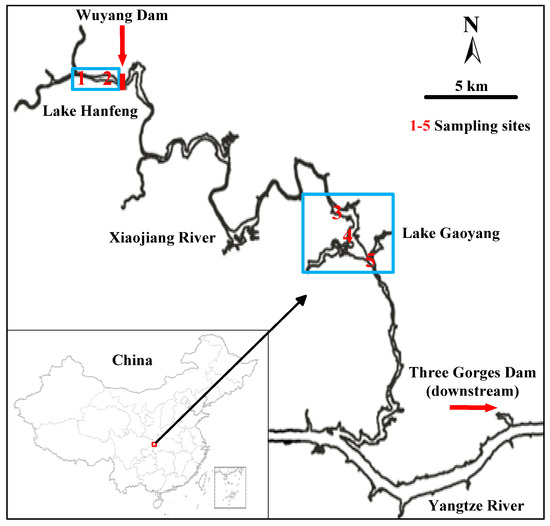 Location of Lakes Hanfeng and Gaoyang (indicated by blue boxes) along the Xiaojiang River in the TGR, China. The red numbers 1–5 represent the five sampling sites.