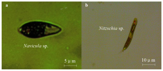Microscopic photographs of (a) Navicula sp. and (b) Nitzschia sp.