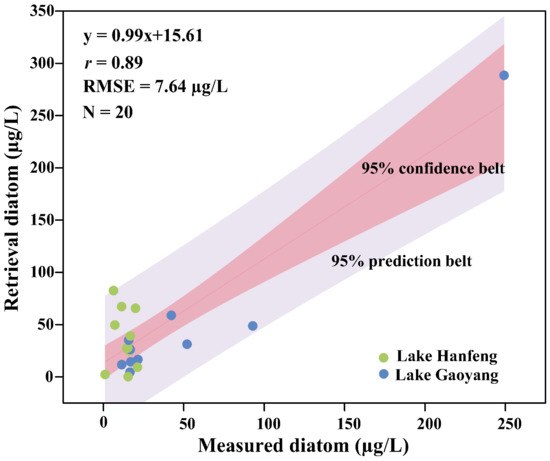 An in situ dataset was collected using ship surveys during different seasons and reservoir operation periods over the past five years, which to some extent ensures the retrieval accuracy of the SVD model. A total of 43 cloud-free Sentinel-2 MSI images were provided between 2019 and 2023, fully covering the bloom period in the typical TGR tributary. Four of these images correspond to our ship surveys (sampling interval between in situ and satellite observations is less than 3 d, and weather conditions at the two sampling times are similar). According to the microscopic examination, the ranges of abundance and relative abundance of diatoms matched with satellite observations are 13–1514 × 104 cells/L and 3.2–74.57%, with the mean values of 106 × 104 cells/L and 18.97%, respectively, indicating that algal samples cover various experimental scenarios such as no algal blooms, diatom blooms, and non-diatom blooms. As shown in Figure 4, the relationship between measured and retrieval diatom concentrations is inseparable (r = 0.89, RMSE = 7.64 μg/L, and the p-level < 0.05), which is consistent with diatom studies in coastal waters, e.g., the Bohai Sea, Yellow Sea, and East China Sea [45], indirectly providing the SVD model with reliability in the typical TGR tributary.