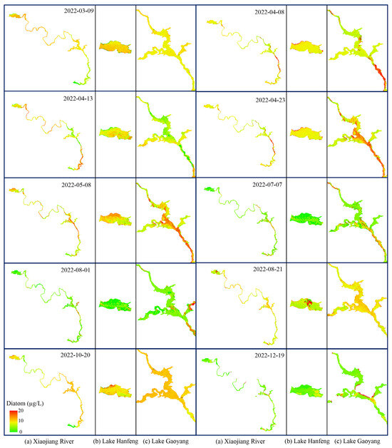 Diatom distribution examples in (a) the Xiaojiang River, (b) upstream Lake Hanfeng, and (c) downstream Lake Gaoyang through a hydrological year.
