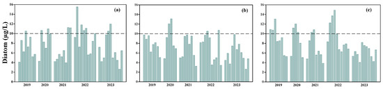 Time series of mean diatom concentrations in (a) the Xiaojiang River, (b) upstream Lake Hanfeng, and (c) downstream Lake Gaoyang from 2019 to 2023. The horizontal dashed line indicates the threshold of diatom bloom occurrence, i.e., diatom concentration = 10 μg/L.