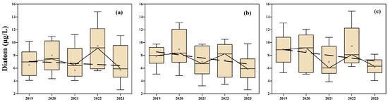 Boxplots for yearly mean diatom concentrations in (a) the Xiaojiang River, (b) upstream Lake Hanfeng, and (c) downstream Lake Gaoyang from 2019 to 2023. The dashed lines denote the yearly diatom trends, and the solid lines connect the yearly mean diatom concentrations.