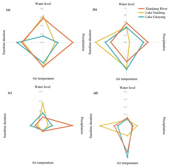 Figure 9b presents the relationship between yearly mean diatom concentration and hydrological/meteorological drivers. As expected, precipitation appears to have a close correlation with diatom concentration in the Xiaojiang River (r = −0.64); moreover, advances in sunshine duration and air temperature can transform the diatom concentration into an accelerated rising in the upstream Lake Hanfeng and downstream Lake Gaoyang, according to the intense positive correlation (r ≥ 0.6), indicating that the response of yearly diatom trends to the local climate is statistically significant.