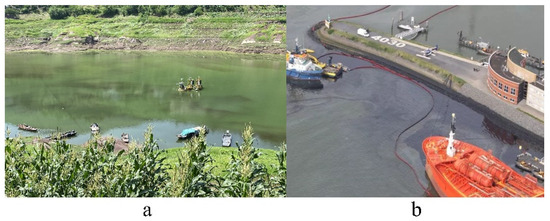 Comparative examples between field photographs of (a) harmless diatom bloom (Lake Gaoyang in April 2023) and (b) ship oil spill (Rotterdam, The Netherlands, in April 2019).