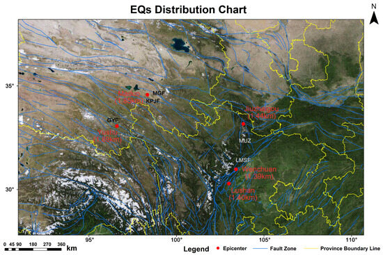 The western region of China, located at the collision boundary between the Indian and Eurasian plates, is characterized by complex geological structures. This area is particularly prone to frequent seismic activity [40]. In the last two decades, five major EQs (Ms ≥ 7) have struck this region, causing widespread destruction and significant loss of life. The Wenchuan, Yushu, Lushan, Jiuzhaigou, and Maduo EQs were selected for analysis, and details are given in Table 1. The Longmenshan Fault (LMSF) zone, approximately 500 km long and 70 km wide, is located on the eastern margin of the Qinghai–Tibet Plateau and connects to the Sichuan Basin. It includes the Hill-Back Fracture, the Mid-Fracture, and the Hill-Front Fracture, along with their associated folds [41]. This fault zone was responsible for the Wenchuan and Lushan EQs. The Jiuzhaigou EQ occurred at the northern terminus of the Minshan Uplift Zone (MUZ), where several major faults intersect, including the Tazang Fault, the Northern Huya Fault, and the Minjiang Fault [42]. The Yushu EQ occurred on the Ganzi-Yushu Fault (GYF), part of the western segment of the Xianshuihe Fault system, a prominent left-lateral strike–slip fault in Eastern Tibet [43]. The Maduo EQ probably occurred on either the Kunlun Pass-Jiangcuo Fault (KPJF) or the Maduo-Gande Fault (MGF), both within the Bayan Har Block, about 70 km south of its northern boundary, the Eastern Kunlun Fault [44,45]. The spatial distribution of the selected study EQ cases is shown in Figure 1.