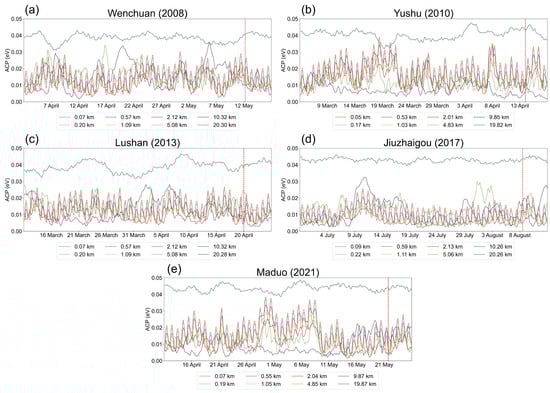 Table 3 presents the dates on which anomalous ACP, exceeding 2, appeared for each EQ. For the Wenchuan EQ (a), anomalies were observed on days −74, −72, and −18. For the Yushu EQ (b), anomalies were noted on days −29, −26, −4, −6, 13, and 14. During the Lushan EQ (c), anomalies were apparent on days −47, −44, and −39. For the Jiuzhaigou EQ (d), anomalies were seen on days −29, −28, and 2. Lastly, during the Maduo EQ (e), anomalies were detected on days −68, −61, −60, and −14.
