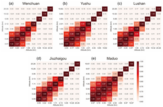 PCC (Pearson Correlation Coefficient) of ACPs at eight distinct altitudinal strata during the Wenchuan (a), Yushu (b), Lushan (c), Jiuzhaigou (d), and Maduo (e) EQ periods.