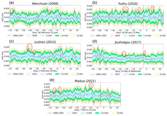 Figure 4 provides a statistical comparison of ACP values during specific years against historical data. Figure 4a presents a comparison between the ACP measurements from the Wenchuan EQ in 2008 and the background data collected from 1980 to 2007, specifically from 26 February to 12 June. The figure clearly illustrates that the ACP values on 28 February, 1 March, and 24 April exceeded the background value by more than 2. Similarly, Figure 4b sets the ACP values from the Yushu EQ in 2010 against the background data from 1980 to 2009, encompassing the period from 28 January to 13 May. The figure reveals that on 15 March, 18 March, 20 March, 7 April, 26 April, and 27 April, the ACP values exhibited anomalies. Figure 4c juxtaposes the ACP values from the Lushan EQ in 2013 with the background data spanning from 1980 to 2012, covering the period from 4 February to 20 May. It indicates that on 4 March, 7 March, and 12 March, the ACP values deviated significantly from the background. Figure 4d contrasts the ACP values from the Jiuzhaigou EQ in 2017 with the background data from 1980 to 2016, spanning the period from 24 May to 8 August. The figure underscores that on 25 May, 26 May, 9 July, 10 July, and 9 August, the ACP values surpassed the background value by more than 2. Finally, Figure 4e compares the ACP values from the Maduo EQ in 2021 with the background data from 1980 to 2020, which covers the period from 7 March to 21 June. The figure demonstrates that on 14 March, 21 March, 22 March, and 7 May, the ACP values showed notable anomalies.