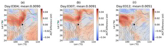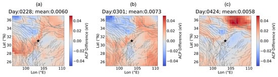 ACP anomaly distribution maps during the period of the 2013 Lushan EQ. These maps were obtained by subtracting the spatial distribution on the reference date (26 March) from the distributions on the anomaly dates 4 March (a), 7 March (b), and 12 March (c). Labeled as shown in Figure 5.