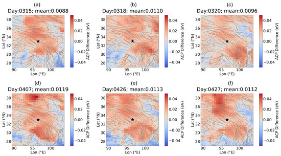 ACP anomaly distribution maps during the period of the 2010 Yushu EQ. These maps were obtained by subtracting the spatial distribution on the reference date (27 February) from the distributions on the anomaly dates of 15 March (a), 18 March (b), 20 March (c), 7 April (d), 26 April (e), and 27 April (f). Labeled as shown in Figure 5.
