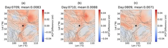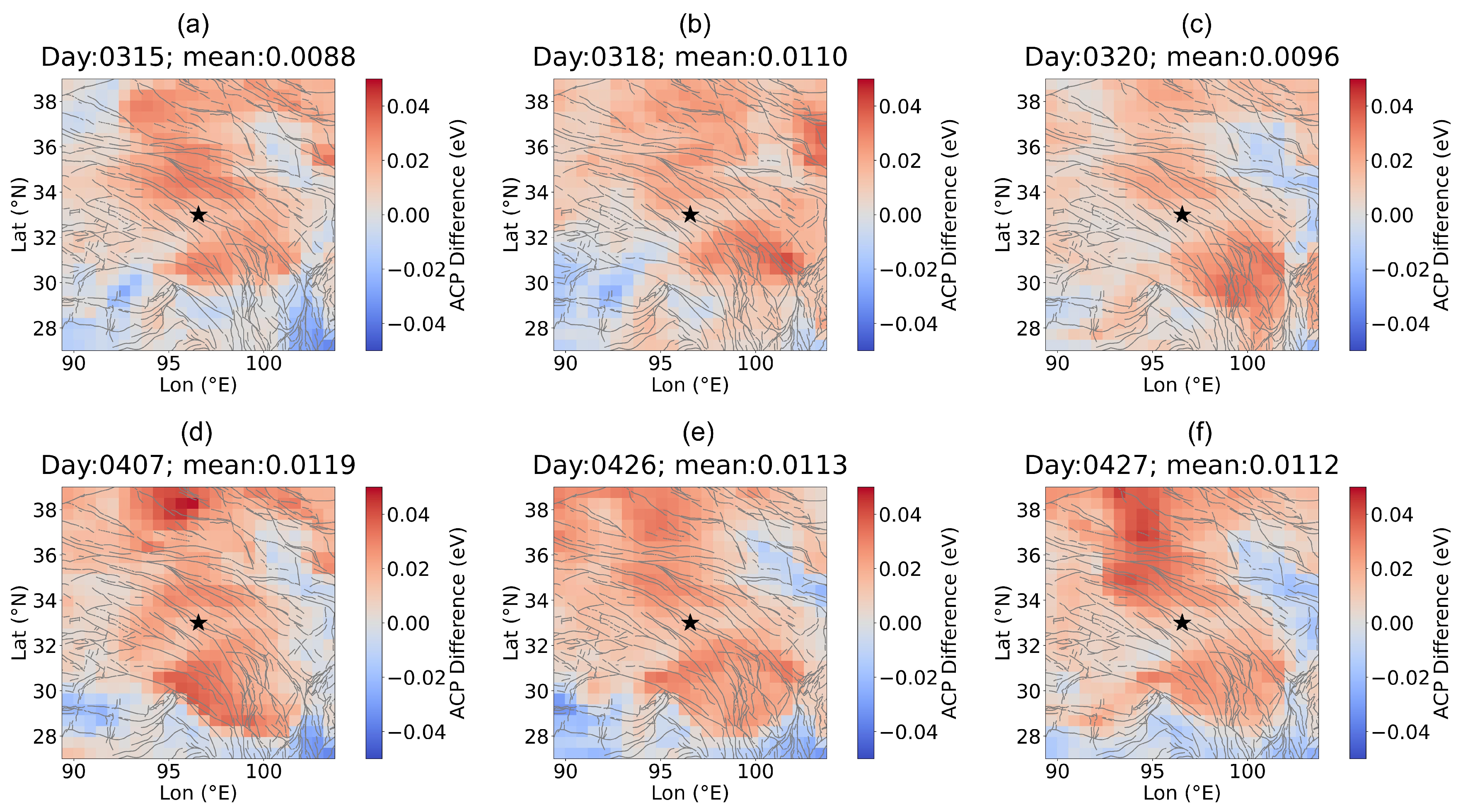 In order to investigate the spatial distribution of ACP anomalies before and after the seismic event, we first extracted the spatial distribution of ACP anomalies on dates exceeding 2. Subsequently, we identified the date for each EQ in Figure 4 during the year of EQ occurrence (indicated by the red dashed line) that most closely matched the mean of the historical data (represented by the blue solid line) as the reference date. Finally, we subtracted the spatial distribution of the reference date from that of the anomaly dates to obtain the anomalous spatial distribution.