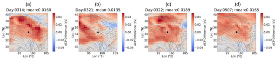 ACP anomaly distribution maps during the period of the 2017 Maduo EQ. These maps were obtained by subtracting the spatial distribution on the reference date (28 March) from the distributions on the anomaly dates of 14 March (a), 21 March (b), 22 March (c), and 7 May (d). Labeled as shown in Figure 5.