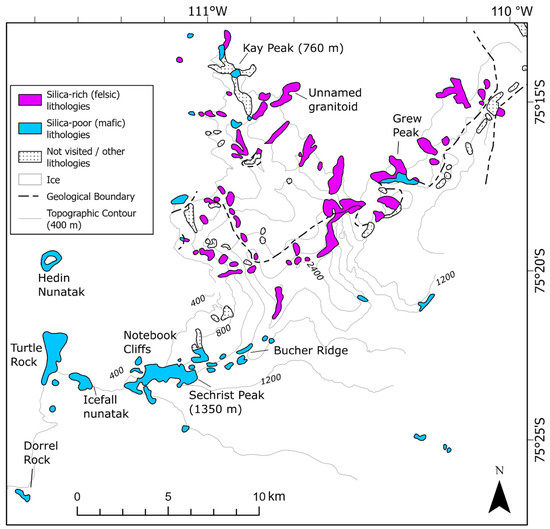 Rock outcrops that are presently exposed above the ice sheet surface in Antarctica can provide direct evidence for past ice thickness by using cosmogenic nuclide surface exposure dating of their surfaces [1,2,3]. Quartz is often the preferred target mineral for extraction of cosmogenic nuclides because the most commonly measured cosmogenic nuclides (e.g., 10Be, 26Al, 14C) are produced within quartz. Felsic rocks are typically preferred over mafic rocks for cosmogenic nuclide exposure dating studies because felsic rocks are silica rich and often contain minerals such as quartz, feldspars and micas, whereas mafic rocks are iron and magnesium-rich and generally contain little or no quartz. There is, however, potential for extraction of cosmogenic nuclides from other minerals, including those common in mafic rocks such as olivine (in situ 14C; [4]) and pyroxene (10Be; [5]). Developing the ability to remotely differentiate felsic from mafic rocks would enable identification of areas where bedrock lithologies are likely to be favourable for application of a specific target mineral and/or nuclide, permitting forward planning for future exposure dating field campaigns. The geology of the polar regions, especially Antarctica is, however, often sparsely mapped, and many outcrops are extremely challenging to access [6]. Thus, in some areas, virtually nothing is known about the composition of the outcropping rocks.
