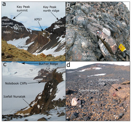 Figure 3. Field photos of Mt Murphy showing Kay Peak (a,b) and Turtle Rock, Icefall Nunatak and Notebook Cliffs areas (c,d). (a) Kay Peak viewed facing south from the ridge extending northward from Kay Peak showing darker mafic/basalt volcanic rock emplaced over lighter felsic/gneiss basement; contact is indicated by white dashed lines. (b) Outcrop of felsic gneiss at Kay Peak ridge (north), including sample KAY-111. (c) View from Icefall Nunatak (foreground) looking eastwards to Notebook Cliffs and Bucher Ridge. Distinctive light orange bands visible at Notebook Cliffs are similar to hydrovolcanic/hyaloclastite deposits described elsewhere [47] (d) Summit of Notebook Cliffs showing a mixture of light-orange hyaloclastite breccia, darker basalt, and a granite erratic. Images from ANiSEED 2015–2016 Field Report [2].