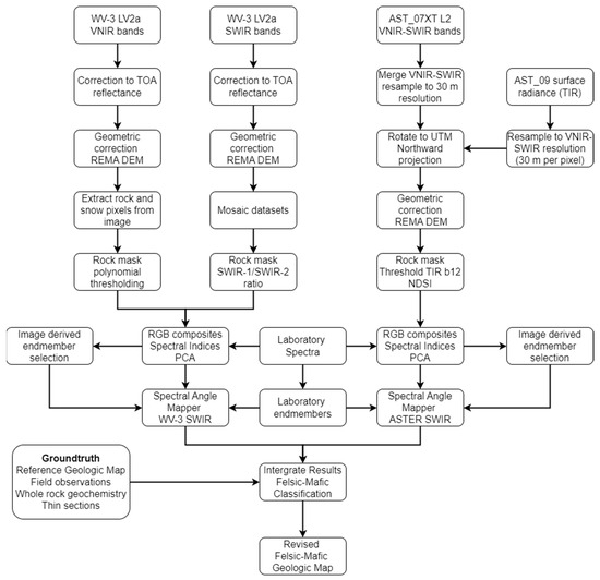 Figure 5. Flow chart summarising pre-processing steps and spectral analysis of laboratory spectra, WV-3 and ASTER datasets for mafic-felsic classification and mapping of Mt Murphy. Spectral mapping and classification techniques are explained in Section 3.3 and in detail in Supplement S1.