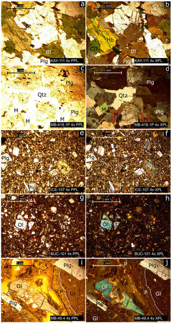 Figure 7. Photomicrographs of Mt Murphy rock specimens: gneiss—KAY-111 (a,b), granite—MB-418.1P (c,d), basalt—ICE-107 (e,f), weathered basalt—BUC-101 (g,h), and fragmental hydrovolcanic rock—MB-49.4 (i,j) in plane-polarised (PPL) and cross-polarised light (XPL). Bt—biotite, Cl—chlorite, Gl—glass, Hb—hornblende, M—muscovite, Ol—olivine, P—palagonite, Plg—plagioclase, Py—pyroxene and Qtz—quartz. Sample name, polarisation and scale shown on each panel. The white dashed lines in panels (i,j) indicate the border between fresh glass (Gl) and altered glass/palagonite (P).