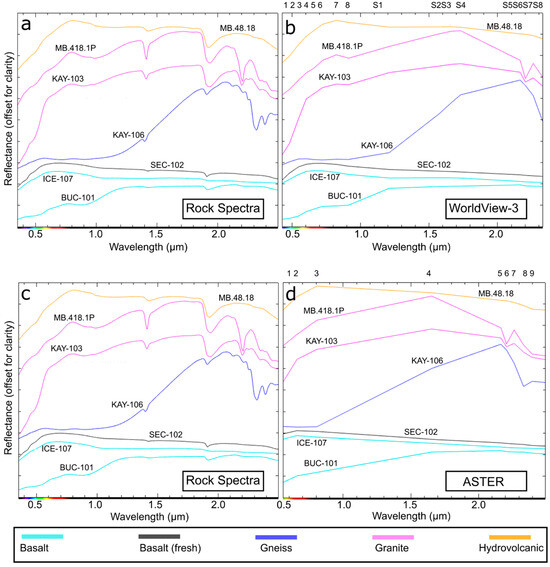 Figure 8. Mt Murphy sample rock spectra profiles (a,c) resampled to VNIR-SWIR Worldview-3 sensor bandpass (b) and ASTER bandpass (d). Panel (a) and Panel (c) show the same spectral profiles to make comparisons to WV-3 and ASTER convolved spectra clearer.