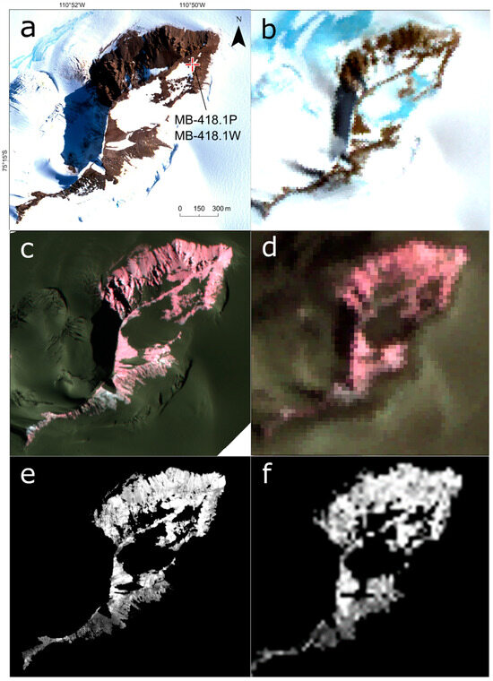 Figure 9. (a) WV-3 VNIR 532 contrast-enhanced true colour composite showing approximate GPS location (red cross) of MB-418.1P and MB-418.1W. (b) ASTER VNIR 321 image (15 m resolution). (c) WV-3 SWIR 368 false colour composite (contrast-enhanced). (d) ASTER 468 false colour composite showing equivalent to (c) at ASTER spatial resolution; the pink tone in both images is associated with intense hydrated mineral absorption from the Al-OH bond stretch. (e) WV-3 Al-OH RBD index (bS5 + bS7)/bS6, bright pixels indicate intense absorption at 2.2 μm associated with muscovite. (f) ASTER Al-OH RBD index (b5 + b7)/b6 showing equivalent to (e) at ASTER 30 m spatial resolution.