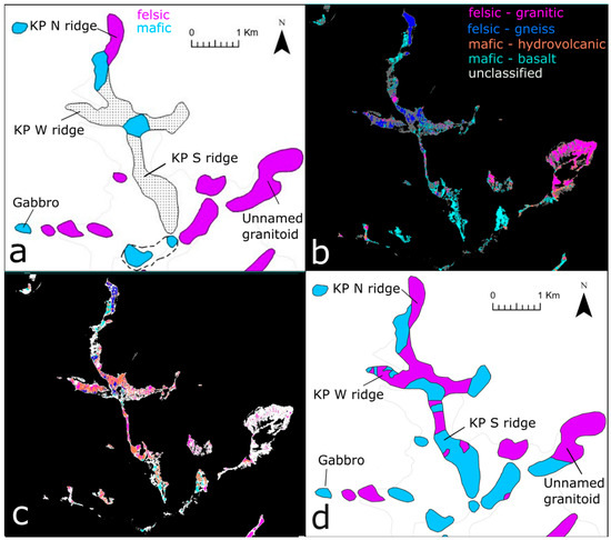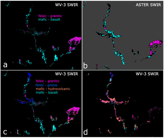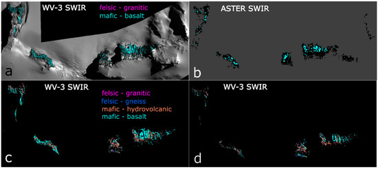 Figure 12. Supervised classification of key lithological groups at Kay Peak showing (a) WV-3 image endmember derived felsic-mafic classification (0.1 rad). (b) ASTER image endmember derived felsic-mafic classification (0.04 rad). (c) WV-3 image derived endmembers; granite, gneiss, hydrovolcanic rock and basalt (0.1 rad), and (d) laboratory spectra derived classification with all 17 samples simplified to four endmember types (0.1 rad).