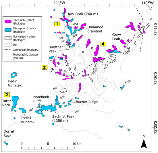 Mt Murphy consists of a main volcanic edifice emplaced over a north sloping block of much older pre-volcanic basement [15]. The site has been mapped and described in previous work focused on Mt Murphy’s eruptive and tectonic history [12,13,15,16,37] and more recently with focus on its glacial history [2,38,39,40]. Observations from field expeditions associated with these studies provide a good measure of Mt Murphy’s general geological characteristics. Mt Murphy’s northern section, including Kay Peak (Figure 1b), consists of a pre-volcanic metamorphosed basement and at least one large granitoid intrusive [14]. Outcrops surrounding Mt Murphy on its west and southwest flanks (Hedin Nunatak, Turtle Rock, Icefall Nunatak and Notebook Cliffs; Figure 1b) are all composed of mafic basalt lava flows and hydrovolcanic fragmental rocks, formed during volcanic eruptions dating from 9.5–0.6 Myr ago [12]. An additional large mafic intrusive to the south of Mt Murphy, Dorrel Rock, is composed of Oligocene gabbro [16]. Several smaller mafic parasitic cones formed of tuff and scoria are also present at the site [15]. The upper reaches of Mt Murphy (above 1900 m elevation) are comprised of volcanic rocks of intermediate-to-felsic composition [12,37]. However, much of the edifice remains sparsely mapped, especially at higher elevations, where many outcrops have never been visited and whose observation has previously relied on binocular observations.