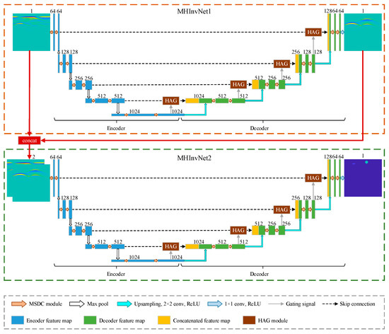 HAG employs a combination of CAG and SAG in a series configuration. It first applies channel attention weighting to the input feature map, followed by spatial attention weighting to the channel-attended feature map. This approach highlights the important features in both the channel and spatial dimensions, thereby enhancing the overall feature extraction ability of the network. In this study, the HAG module is introduced into each layer’s skip connection of both MHInvNet1 for denoising and MHInvNet2 for inversion.