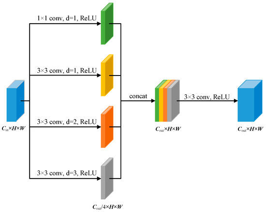 The MSDC module has four convolutional layer branches, including one branch with a convolution kernel size of 1 1 and three branches with convolution kernel sizes of 3 3. The dilation rate of the 1 1 convolution kernel is set to 1, and the dilation rates of the 3 3 convolution kernels are set to 1, 2, and 3, respectively. Using Formula (1), it can be seen that the equivalent convolution kernel sizes of the four convolution layer branches from top to bottom in Figure 4 are 1 1, 3 3, 5 5, and 7 7, respectively. The input feature map first goes through the four convolution layer branches to capture feature information at different scales, while compressing the channel dimension to 1/4 of the output feature map size, obtaining the feature map , where i = 1, 3, 5, 7, represents the sizes of the equivalent convolution kernels corresponding to the four convolution layer branches, represents the number of channels in the input feature map, represents the number of channels in the output feature map, and and represent the height and width of the feature map. Then, concatenating results in the fused feature map . Finally, after passing through a 3 3 convolutional layer and ReLU activation function, the output feature map is obtained. The specific implementation process can be described using mathematical formulas: