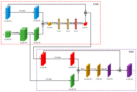 When the encoder of the network downsamples to a deeper level, it extracts higher-level and more abstract feature information while losing some spatial information. By connecting the feature maps of the encoder and decoder through skip connections, it can compensate for lost spatial information. However, not all skip connections are useful. Since the lower-level features of the encoder may contain unwanted interference, this interference will negatively impact the effect of the skip connection fusion feature map. To highlight important features during the skip connection process and suppress unwanted interference, inspired by Attention U-Net [18] and ECANet [19], this study proposes a HAG module consisting of two parts: Channel attention gate (CGA) and Spatial attention gate (SGA), as shown in Figure 5.