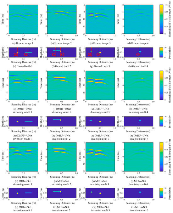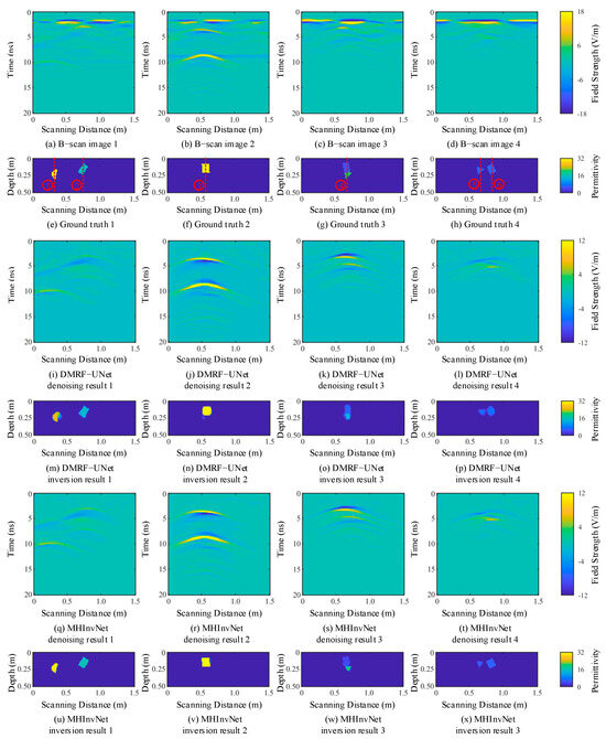 The denoised B-scan and permittivity map outputs are normalized to between −50 V/m and 75 V/m, and 0 to 32, respectively. Figure 6 shows the denoising and inversion results of different networks after normalization. Regarding denoising, as shown in Figure 6i–l, although DMRF-UNet can effectively remove the echoes of direct waves and clutter caused by soil inhomogeneity, there are still some pixel-level noise spots distributed laterally in the background of the B-scan after denoising. Figure 6q–t indicates that MHInvNet can effectively eliminate noise and unrelated target signals in the noisy B-scan, with almost no noise spots remaining in the background of the B-scan after denoising. In terms of inversion, as shown in Figure 6m–p, the target contours obtained by DMRF-UNet are blurry, with artifacts present, and the inversion effect for stacked targets is poor, sometimes leading to the inversion of false targets. In Figure 6u–x, the MHInvNet results are more accurate, showing clear boundaries between the inverted targets, closely resembling the shapes of the actual underground targets, and performing well when inverting stacked targets. Overall, MHInvNet demonstrates better performance in denoising and inversion. This improvement is attributed to the MSDC module, which extracts and integrates feature information at multiple scales, enabling the network to learn richer global features. Additionally, the HAG module provides attention constraints to the skip-connected feature maps, further enhancing important information in the feature maps and collectively improving the network’s denoising and inversion performance.