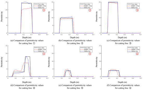 To further validate the accuracy of the proposed network in the specific value inversion of permittivity, this study extracted the permittivity values along the six cutting lines marked from ① to ⑥ in Figure 6b for comparative analysis of the differences between the results inverted by DMRF-UNet and MHInvNet under the same cutting lines and the true permittivity model, as shown in Figure 7. It can be seen from Figure 7a–f that MHInvNet performs better in the specific value inversion of permittivity than DMRF-UNet. A further examination of Figure 7b,d,e,f reveals that the sizes and positions of the targets inverted by MHInvNet exhibit smaller deviations in the depth direction compared to the true model. Overall, the permittivity curve inverted by MHInvNet is closer to the true underground model curve, with only slight differences in the curve amplitudes.