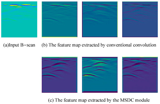 In order to further understand the underlying working principles of the MSDC module and the HAG module, this study extracts the feature maps obtained from the convolutions of different downsampling layers in the inversion network for visual analysis, enabling a more intuitive observation of the effects of these two modules on enhancing network performance. For the MSDC module, feature maps are extracted from the convolution of the shallowest feature extraction layer of the inversion network. These shallow-layer feature maps are relatively close to the input images and contain information such as textures and edges, demonstrating the network’s ability to capture image details. As shown in Figure 8, when compared to a network that does not incorporate the MSDC module, the extraction of feature maps from the same position and channel reveals that the MSDC module provides better performance in the feature extraction of target signals. It can clearly delineate the edges and contours of the target signals, preserve details related to them, and capture a greater amount of feature information.