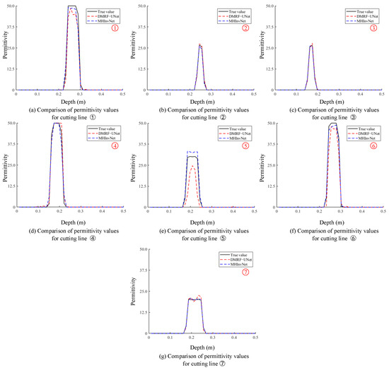 Similarly, to validate the accuracy of the network in the specific value inversion of permittivity in actual measurement data, a comparative analysis of permittivity values was conducted along the seven cutting lines marked from ① to ⑦ in Figure 10b, as shown in Figure 11. It can be observed that the permittivity values inverted by MHInvNet are more accurate than DMRF-UNet, with only a relatively large error in the inverted target permittivity along the cutting line ⑤. Further examination of Figure 11a,f,g reveals that the distribution of target permittivity inverted by DMRF-UNet is not uniform, exhibiting slight oscillations in the permittivity curve. By contrast, the permittivity curve of MHInvNet is relatively smoother and closer to the true underground model curve. Overall, MHInvNet achieves better permittivity inversion results along the seven cutting lines.