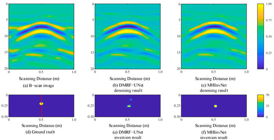 To verify the superior performance of the proposed network, it was compared with the network DMRF-UNet, which follows the same denoising and inversion process. All networks are configured with hyperparameters consistent with those described above. As shown in Table 1, #1 and #2 represent the denoising and inversion results of the networks. The denoising results of MHInvNet achieve SSIM, MAE, and MSE values of 0.99884, 0.16332, and 0.39140, respectively. The inversion results achieve SSIM, MAE, and MSE values of 0.99297, 0.21191, and 21.31944, respectively. Whether in denoising or inversion results, MHInvNet obtains the best scores in all three evaluation metrics. In terms of network model complexity, MHInvNet has 0.87 M fewer parameters than DMRF-UNet, which is attributed to the MSDC module employing dilated convolutions that reduce the computational burden associated with large-sized convolution kernels. Additionally, the HAG module utilizes strategies of local cross-channel interaction and compression of feature map channels to lower the module’s complexity and parameter count. Regarding the time consumed to invert a B-scan image, MHInvNet has fewer parameters and requires slightly less time than DMRF-UNet. Overall, MHInvNet improves network performance while reducing model complexity.