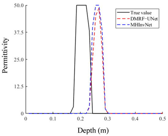 The accuracy analysis of the permittivity inversion along the cutting lines shown in Figure 13d is presented in Figure 14. Due to the positional inversion deviations of MHInvNet and DMRF-UNet, the permittivity curves of both models do not align well with the true model curve in the horizontal coordinate direction. Regarding the values of permittivity, the maximum permittivity of the targets included in the measured dataset used for weight fine-tuning by both networks is 50. By contrast, the permittivity of the steel bar theoretically approaches infinity. Therefore, the correct value obtained for the permittivity of the steel bar during inversion is theoretically the maximum value that the network can invert, which is 50. It can be concluded that since the peak value of the permittivity curve obtained by MHInvNet reaches the theoretically correct value of 50, while that of DMRF-UNet is less than 50, the accuracy of MHInvNet’s permittivity inversion is higher, showing good generalization capability in the specific inversion of permittivity values.