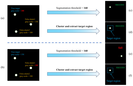 Most current algorithms fail to decide the true target from a saliency feature map with multiple points or can only retain a single feature point as the target through threshold segmentation. However, these methods are highly uncertain and the design of the segmentation threshold is difficult. Figure 1 shows a situation where (a) and (b) are saliency feature maps containing one true target and two false alarms whose grayscales vary. If the true target has the maximum grayscale value as shown in (a), then an appropriate segmentation threshold can successfully retain the target, as shown in (c). Conversely, if the false alarms have a higher grayscale value, then the method to determine the target through the segmentation threshold will fail, as shown in (e). Consequently, we extract the approximate area of the target through clustering, and then precisely lock the unique target through a dual-region search method, efficiently solving the target judgment problem, even if the target’s grayscale is lower than false alarms.