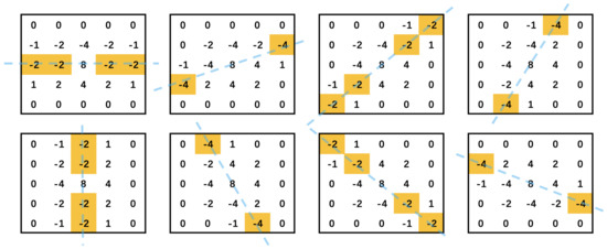Firstly, inspired by the Sobel edge detection algorithm [33], a new filter bank , which can filter out the large image background of the infrared image and preserve the edges, is designed. Figure 2 shows the configuration of the filter bank. It includes eight filter kernels, each measuring 5 × 5, representing eight filtering directions. In each direction, correction factors are set up to make the sum of the filter kernel coefficients equal to zero, and it is the key to filtering out the large image background. The design of the filter kernel is based on the optimization process of the Sobel edge detection operator. In theory, more filtering directions result in better background suppression but also higher computational complexity; therefore, eight directions are relatively appropriate. In order to differentiate the eight directions of the filter kernel, the size of the kernel needs to be 5 by 5 or larger. Nonetheless, expanding the kernel size will result in a higher computational complexity for the algorithm. Therefore, to balance the filtering effect and timeliness, it is appropriate to set the filter kernel to 5 by 5 and design the filter bank with 8 directions.