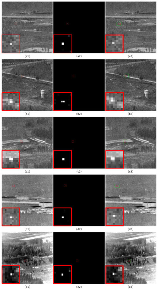 (a1–e1) Original representative images in data05, data06, data08, data15, and data22, respectively. (a2–e2) The filtered feature maps. (a3–e3) Final detection results. The red box represents the target and the green box represents the fixed search region.