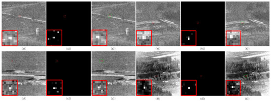 The detection outcomes of the recommended approach are depicted in Figure 7, with the actual target indicated by a red square and the green square representing the fixed search area. The original image reflects many challenges faced in the detection of weak targets in real complex scenarios: the extremely faint target, as in ; the target being submerged by the road, as in ; the target set at the margin of the background, as in ; the large area of bright imaging background, as in ; and numerous environmental noise points, as in . However, the detection results show that the DRSM effectively addresses the aforementioned situations by establishing a small search area. It not only suppresses the background well but also accurately detects and marks the targets.
