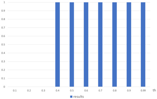 - Segmentation threshold . The key to the success of this algorithm lies in clustering and classification; only by correctly identifying the target class (i.e., the motion trajectory) can we search for the target within that range. Therefore, we adjusted different values of and plotted Figure 10 based on whether clustering and trajectory recognition were successful (1 for success, 0 for failure). The detailed clustering results are shown in Figure 11. It can be seen from Figure 10 and Figure 11 that as long as is greater than or equal to 0.4, clustering can be successful. This means that although affects the clustering results, the range of possible values for is relatively broad. This is because multi-directional filtering enhances the target, thereby reducing the requirements for .