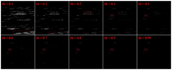 - Insufficient Local Contrast. Essentially, this algorithm remains a detection method based on local features. Although it significantly reduces the requirement for local contrast compared to other local feature-based detection methods, excessively low local contrast can still greatly increase the difficulty of DBSCAN clustering. The issues caused can be mainly divided into two categories. Initially, setting the segmentation threshold excessively high could cause the loss of targets, which hinders effective clustering. Subsequently, setting the segmentation threshold too low might cause a proliferation of dense noise points to cluster, leading to incorrect algorithmic discrimination. Taking data05 as an example, after adding Gaussian white noise with a mean of 0 and a variance of 0.005, the original segmentation threshold would result in clustering failure. Therefore, we altered the segmentation threshold and conducted multiple experiments. The results are shown in Figure 17, where only the experimental group with a threshold of 0.6 achieved successful clustering.
