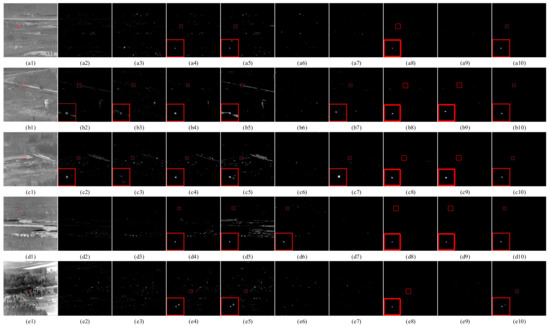 (a1–e1) Original representative images in 5 datasets. (a2–e10) 2-D detection results of HB-MLCM, MPCM, PSTNN, STLCF, TLLCM, WTLLCM, MFSTPT, STBMPT, and DRSM, respectively. The red box represents the target and images without red box indicate detection failure.