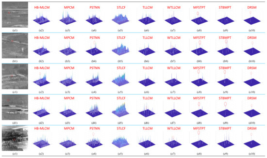 (a1–e1) Original representative images in 5 datasets. (a2–e10) 3-D detection results of HB-MLCM, MPCM, PSTNN, STLCF, TLLCM, WTLLCM, MFSTPT, STBMPT, and DRSM, respectively. The red box represents the target and the red circle represents the targets that can be identified from 3-D results.