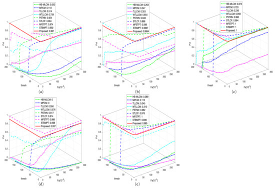 - In this paper, the receiver operation characteristic (ROC) is a three-dimensional curve plotted with false alarms (), the threshold (), and detection rate (). The definition of and is as follows [38]:Furthermore, the area under the curve (AUC) indicates the algorithm’s effectiveness. is derived from the two-dimensional ROC curve , which is employed to assess the overall performance of the algorithm. relates to the two-dimensional ROC curve , reflecting the detection probability at different threshold values , used to assess the target detection capability of a detector. is derived from the two-dimensional ROC curve , focusing on the variation of the false alarm rate with the threshold, evaluating the background suppression capability of a detector. represents overall accuracy and is the signal-to-noise probability ratio, which, specified as follows, are employed to reflect the comprehensive performance of a detector in signal detection and the suppression of background noise.