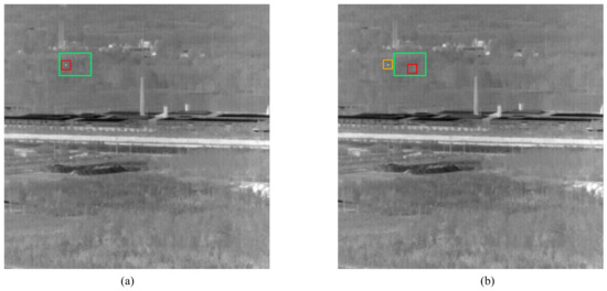 Figure 18. Frame loss in the dataset. (a) is frame 322 from data15, and (b) is frame 323. The green box represents the fixed search area, the red box is the detection result, and the yellow one represents the true target.