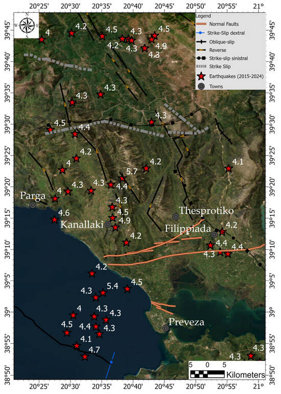 The most recent national seismic hazard map has three seismic hazard zones identified by the New Seismic Code: I = 0.16 g, II = 0.24 g, and III = 0.36 g [35], which is being utilized for infrastructure and building seismic design, and was first released in 2000, updated in 2003, and has not been updated since [36]. The seismic risk for the entire region of Epirus is 0.24 g [37] which indicates a serious hazard to the population. The region of Epirus is characterized by active tectonics and significant seismic activity (Figure 2), making it a dynamic and complex area for geological studies. Since 2015, many earthquakes of magnitude Mw > 4 have occurred.