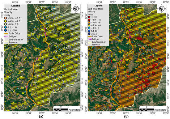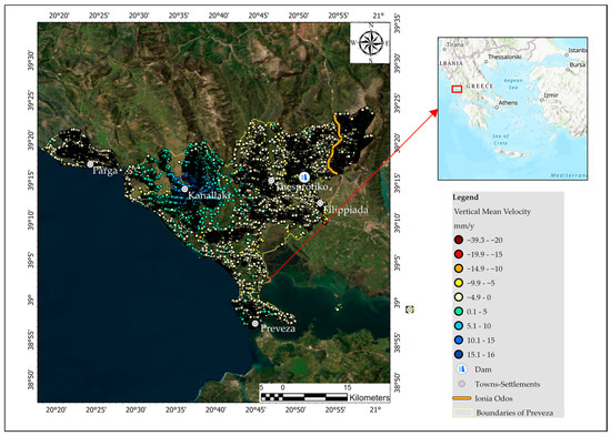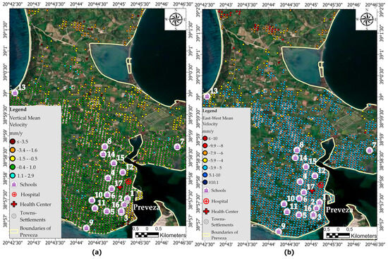 Area of Preveza, vertical (a) and east–west (b) displacement (mm/y), infrastructures (schools, hospital, health center).