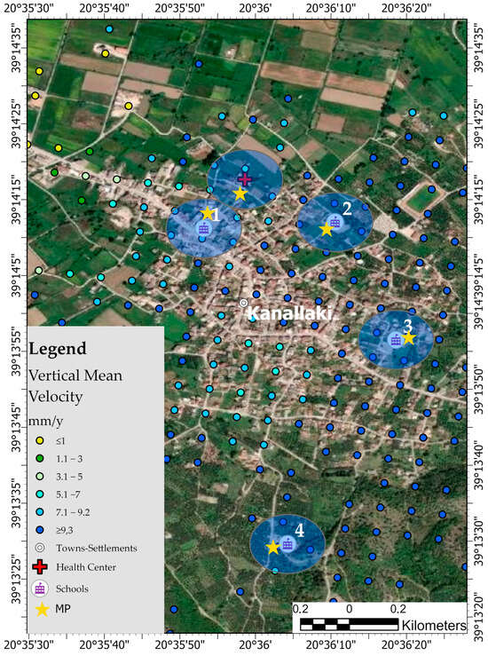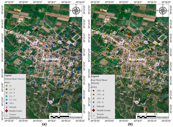 Area of Kanallaki, vertical (a) and east–west (b) displacement (mm/y), infrastructures (schools, health center).