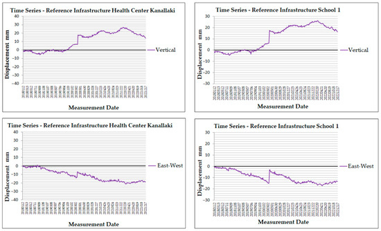 While the vertical displacement showed a sudden uplift, the east–west displacement also reveals a sudden change at the same time. At the initial time of the dataset values are relatively stable close to 0 mm until November 2018, ranging from 1.1 mm to −3 mm. Then, a downward shift is observed reaching the lowest value of −14.9 mm in March 2020. The next two points register similar values of −14.8 mm and −14.3 mm. At the same point in time, in the vertical displacement time series, values suddenly exhibited a sudden increase from −14.3 mm to −6.1 mm; this change slowed down the westward movement. During the remaining period, values return to their initial trend, revealing that the event only had a temporary effect. School 3 in Kanallaki has a similar pattern with a vertical cumulative displacement of 30.5 mm and cumulative east–west displacement of −13,7 mm (Figure 6 and Figure 7).
