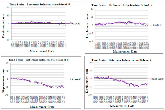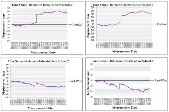 The vertical displacement time series for the MP referenced for School 1 has a stable positive trend with values close to 0 mm (Figure 15) for most of the dataset period (2018–2022), with the highest value reaching 4.7 mm in September 2020. At the end of the time period, values appear slightly negative, reaching −1 mm in December 2022. The east–west displacement has a small positive displacement at the beginning, with values near 0 mm, revealing eastward motion. Slight fluctuations around 0 mm are observed initially, which suggests rather steady conditions. From 2019 until the end of the period (2022), the displacement follows negative values, indicating westward movement, with a minimum of −11.9 mm in August 2022.