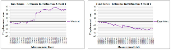 The next vertical displacement time series shows the motion of the MP for School 4 (Figure 12). At the beginning of the period, subsidence is observed, with a trend of recovery. After September 2019, the values are consistently positive, indicating that an uplift has begun to emerge. In this time series, a sudden spike is also observed in March 2020, with values rising sharply from 5.2 mm to 21.9 mm. This change is larger than the one observed for School 3. The uplift continues until the end of the dataset, ending with a value of 33 mm. The east–west displacement time series has a downward trend during the entire dataset, with values ranging from 0.2 mm to −23.1 mm. In March 2020, a similar steep change is observed, with values increasing from −16.7 mm to −8.9 mm. This change temporarily slows the westward movement before it resumes, reaching the lowest value of −23.1 mm in May 2022. School 4 presents a cumulative vertical value of 33 mm, with the cumulative east–west value of −17.9 mm (Figure 6 and Figure 7).