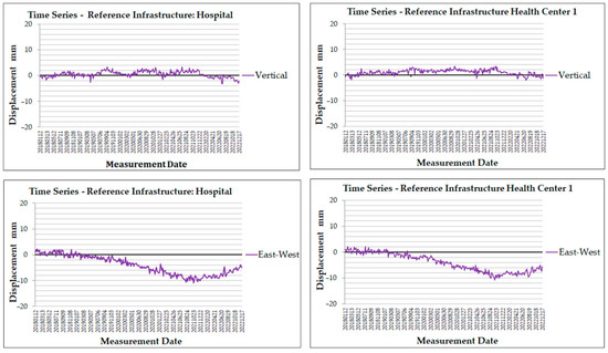 The time series for the east–west displacement of the health center is revealed in the time series of the vertical displacement values around 0 at first. After September 2018, a steady decrease began to appear in the values, showing westward movement and a steep change appeared in the vertical displacement specifically from −13 mm to −7 mm; following this, the downward shift returned with a steady pace, with small fluctuations, continuing westward movement until the value reached −18.7 by the end of the dataset. The event temporarily slowed the westward movement without stopping it. The health center has a cumulative vertical displacement of 14.1 mm and east–west displacement of −18.7 m.